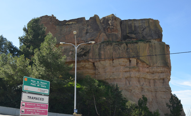 El castillo de Tramaced se encontraba ubicado sobre un peñasco de arenisca a la entrada de la población. Se trataría de un pequeño recinto defensivo de origen andalusí que aprovecha un pitón rocoso, de unos 30 m de eje este oeste por unos 7-8 m de eje máximo norte-sur, cuyas paredes fueron trabajas artificialmente para conseguir unos desniveles verticales que convertían a esta posición en una fortaleza inexpugnable. La estructura general es típica de las fortificaciones rurales andalusíes de la región oscense, con paredes rocosas verticales, cumbre amesetada y escasa superficie, unos 180 m cuadrados en este caso. El acceso se localizaba en la cara sur del extremo oriental, por medio de estructuras de madera, ya desaparecidas, que se prolongaban en un tramo de escalera tallado en la roca que daba paso a una pequeña terraza o descansillo ante la puerta propiamente dicha, también trabajada en la arenisca. El recinto superior, del que quedan escasos vestigios, contó con estructuras de obra, de las que aparentemente solo subsiste la primera hilada de sillares de arenisca (de los que se conservan al menos tres). No obstante, el elemento más importante del conjunto es el aljibe, localizado en el centro de la cara norte y del que se conserva la mitad dado que su extremo septentrional ha desaparecido debido a la erosión y a los desprendimientos de la roca. Este depósito, tallado en la cantera de arenisca y que contaba con unos 5-6 m de eje máximo por una anchura indeterminada, conserva además un muro interno de sillares en la cara oriental.
